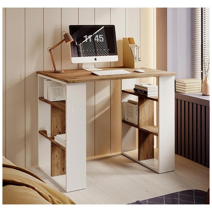 Dieser Schreibtisch kombiniert einen rustikalen Look in Holzfarbe mit einem modernen matten Weiß. In den Tischbeinen sind Ablagefächer integriert. Das Zusammenspiel von Farben und Zweckmäßigkeit verleiht diesem Schreibtisch einen raffinierten Look, der in jedes Interieur passt.