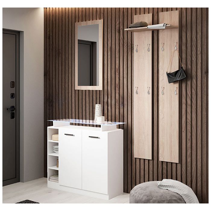 Sie suchen ein elegantes und modernes Flurset? Mit diesem Set aus 3 Möbelstücken können Sie Ihren Flur in einem Rutsch dekorieren. Das Set besteht aus einem Dielenmöbeln, einer Garderobe und einem Spiegel. Der Dielenmöbeln ist aus glänzendem Melamin gefertigt und hat Metallgriffe.