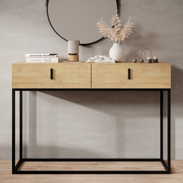 Die Flurmöbel bietet eine große Ablagefläche für deine Habseligkeiten oder Dekorationsgegenstände. Außerdem verfügt er über 2 praktische Schubladen zur Aufbewahrung von Schlüsseln, Briefen und anderen Dingen, die du immer griffbereit haben möchtest.
