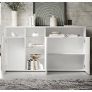 Sideboard Clark L ist sehr stilvoll gestaltet. Die Struktur ist aus glänzendem Melamin und die Türen sind aus hochglänzendem Melamin gefertigt. Der Schrank hat drei Türen, die mit einem praktischen Push-and-Click-System ausgestattet sind. Der offene Raum ist mit drei Glasböden ausgestattet. Hinter diesen Platten befindet sich LED-Beleuchtung, die eine zusätzliche Atmosphäre in Ihrem Raum schafft. Das Sideboard Clark L ist elegant, geräumig und praktisch zugleich