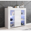 Das Möbel hat sechs Fächer an den Seiten, die durch vier Glasböden mit eingebauter LED-Beleuchtung getrennt sind. Dazwischen befindet sich eine Tür mit 3 Staufächern dahinter. Die Struktur, die Fronten und die Tür sind aus glänzendem Melamin.