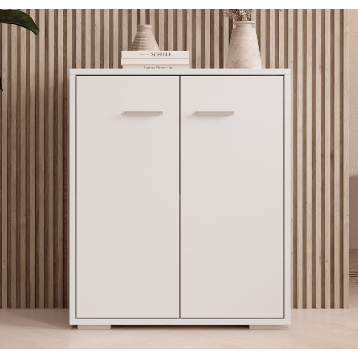 Moderner und multifunktionaler kleine Schrank. Er hat ein attraktives Design, das ihn für alle Arten von Räumen geeignet macht. Du kannst ihn als Sideboard im Wohnzimmer oder in der Wohnküche verwenden, aber auch als Bücherregal, Kommode, Beistellmöbel, Ablage im Flur oder im Büro. Besteht aus zwei Fächern mit Türen zur Aufbewahrung von Haushaltsgegenständen, Büchern, Ordnern, Kleidung usw. Auf der großzügigen oberen Ablagefläche können Sie dekorative Elemente, Utensilien, die Sie immer zur Hand haben müssen, oder Küchengeräte platzieren. Dieses Möbelstück eignet sich besonders für kleine Räume, in denen eine aufgeräumte und übersichtliche Umgebung sehr wichtig ist. Ein Möbelstück mit minimalistischem Design, das eine praktische und dekorative Ergänzung für Ihr Zuhause sein wird.